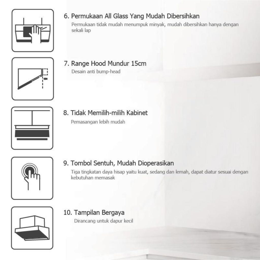 Range Hood ZMG6009 permukaan yang dilengkapi dengan kaca sehingga mudah di bersihkan dan